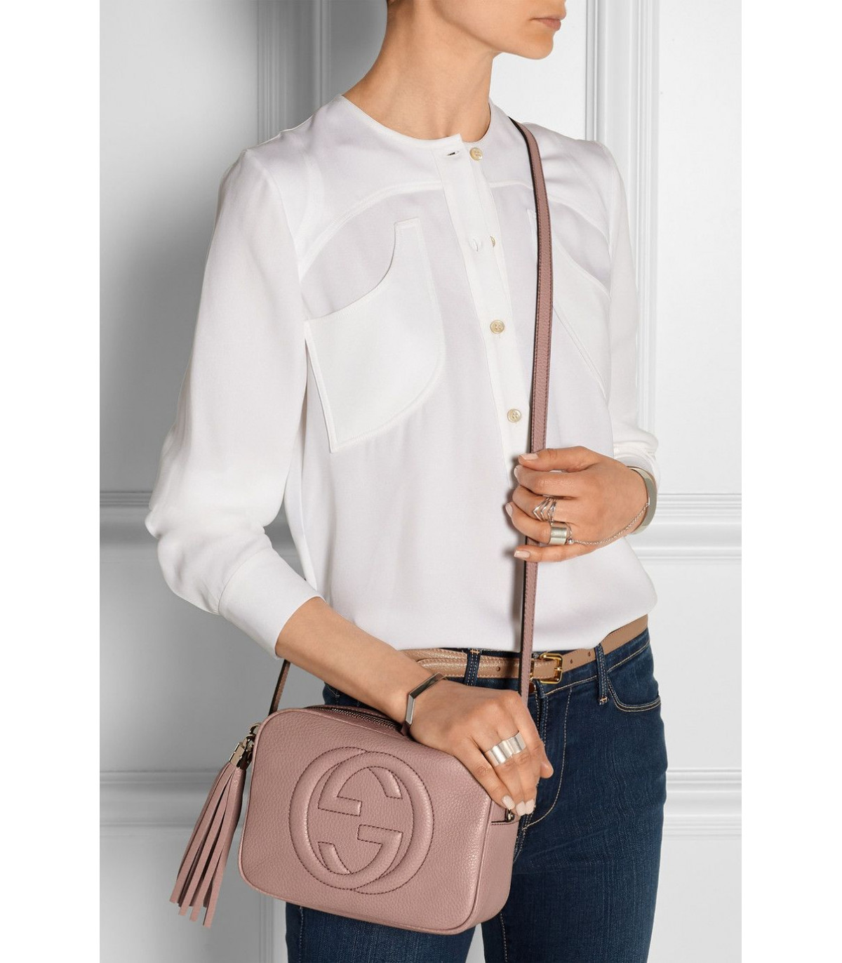 A compact shoulder bag with a leather tassel zipper pull. Sized to fit the necessities. Made in our light, natural grain leather.