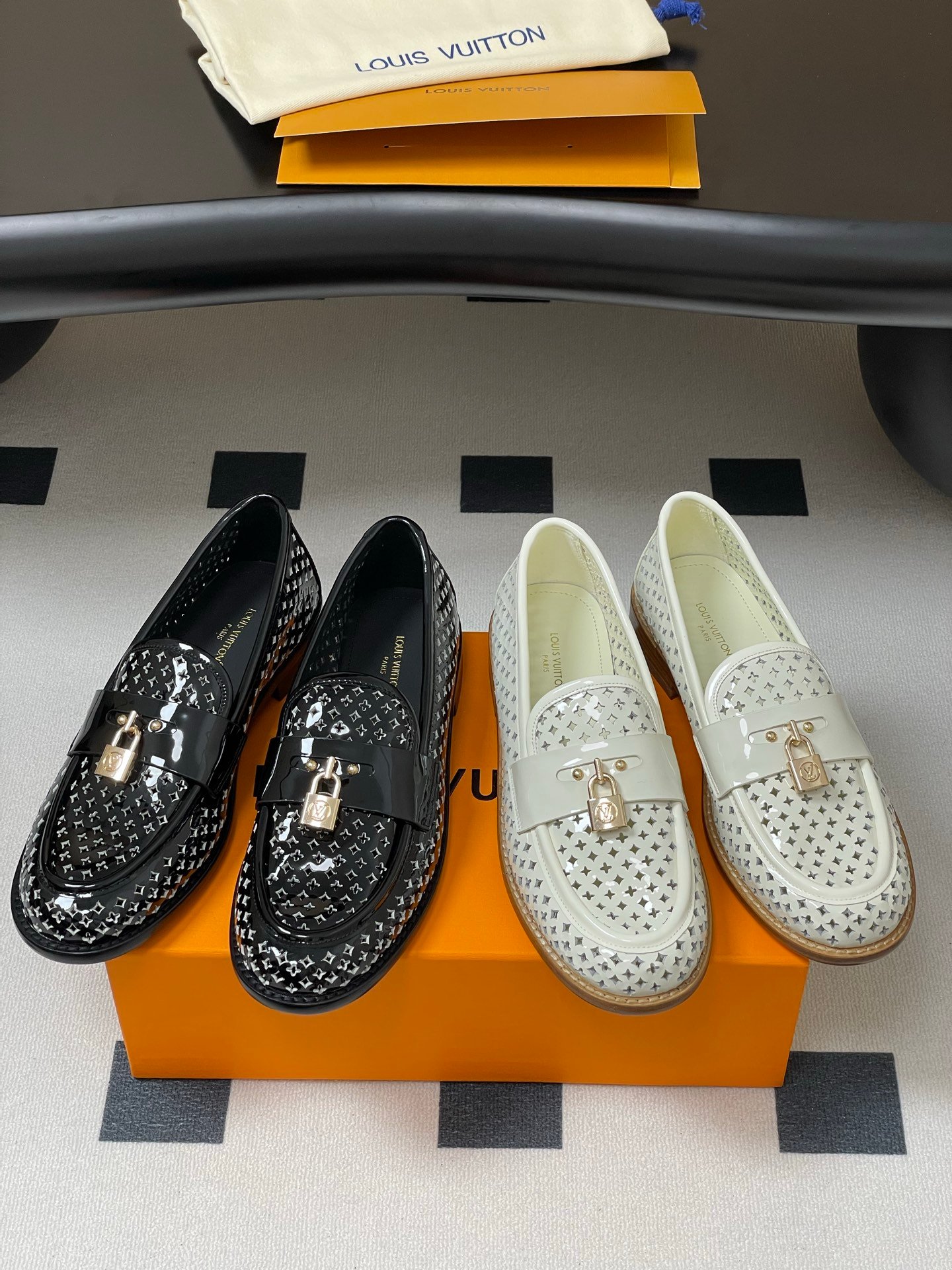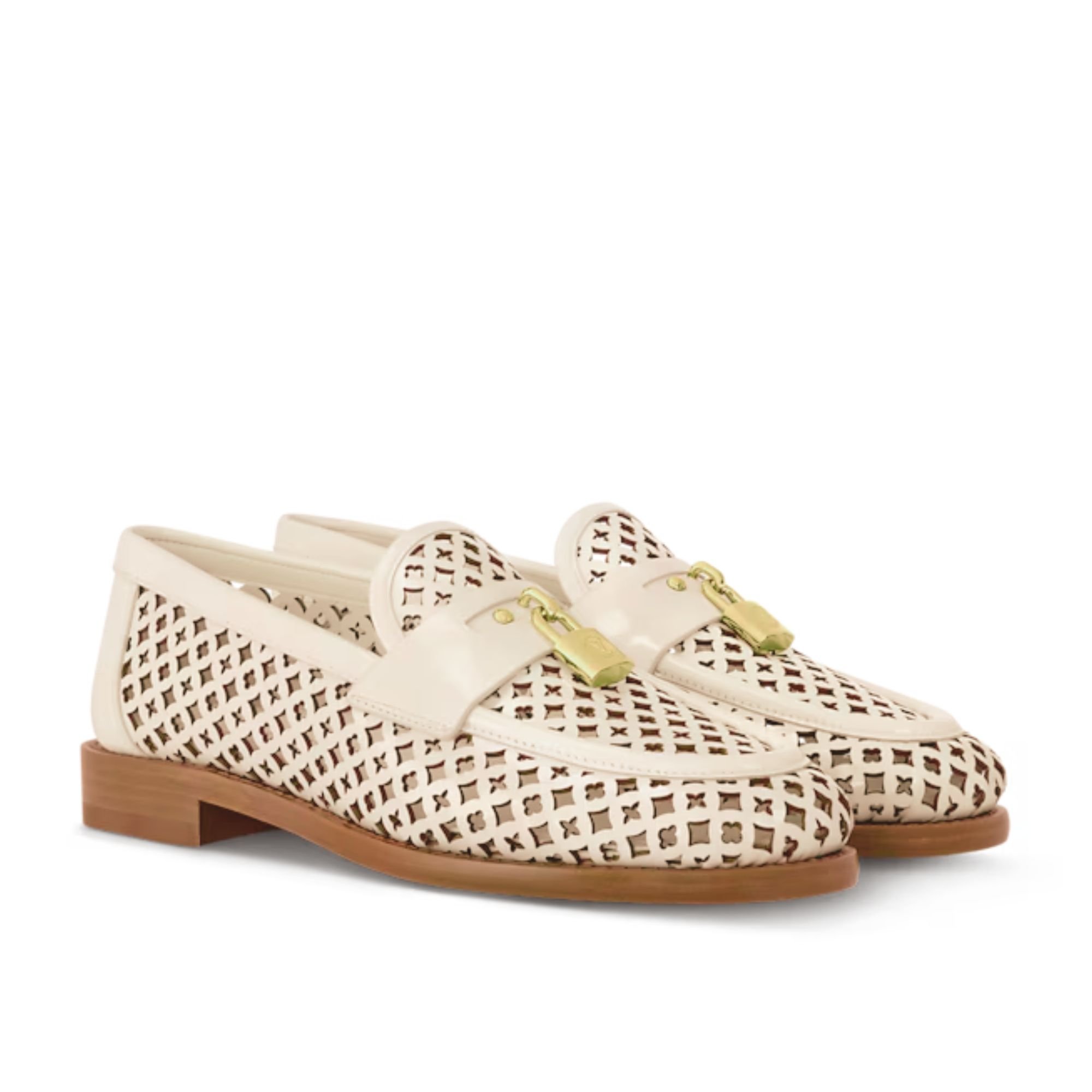 Louis Vuitton Chess Flat Loafer White Monogram Embroidered with Gold Padlock 1AGXRV