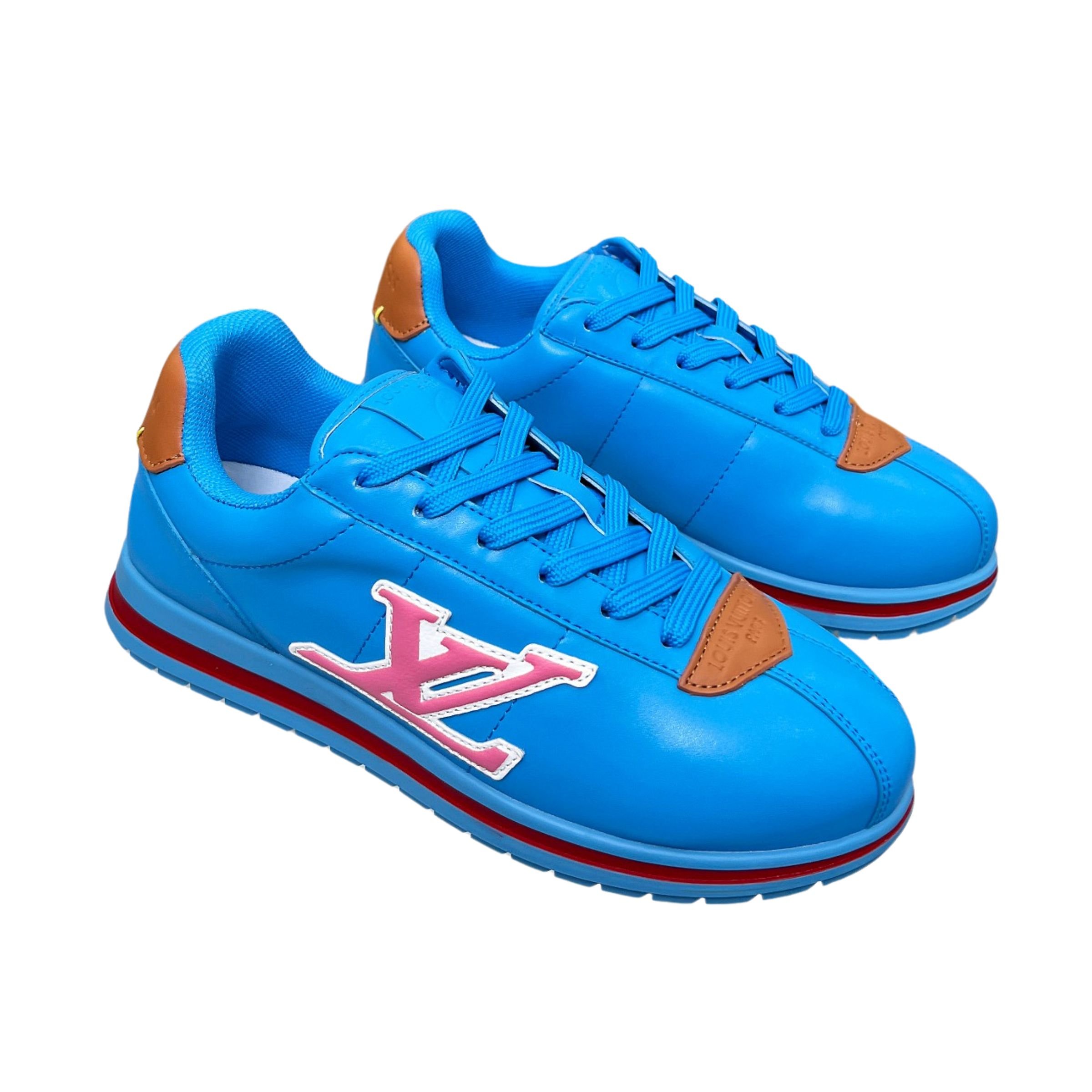 Louis Vuitton LV Trainer Sneaker Blue & Pink �C Red Stripe Sole �C Women’s Shoes