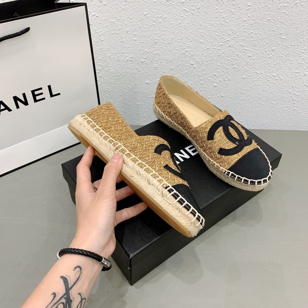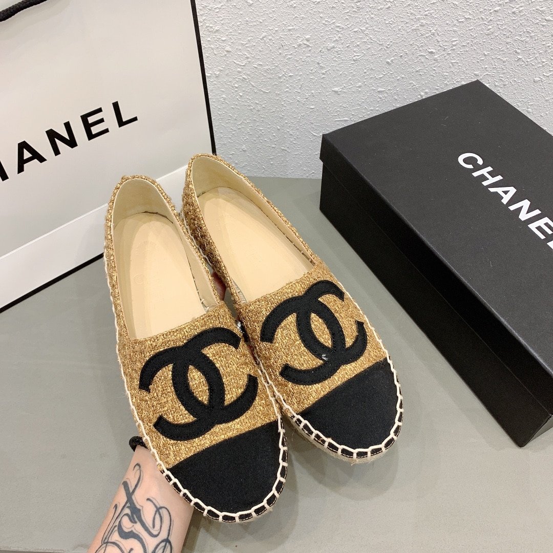 • Chanel Cc Espadrilles Tweed Slip On Crinkled Beige