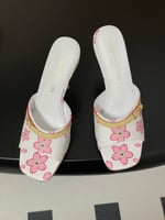 Iconic Louis Vuitton x Murakami Cherry Blossom Mule in white monogram canvas. Features pink sakura floral print, yellow leather strap, and open toe design. Rare Y2K collectible.
