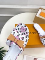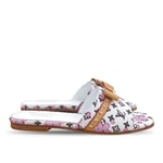 Limited edition Louis Vuitton x Murakami mule in white multicolor monogram canvas. Features pink cherry blossom floral print, gold-tone stud details, and scalloped trim. Y2K collector’s favorite.