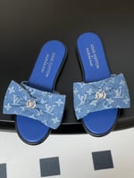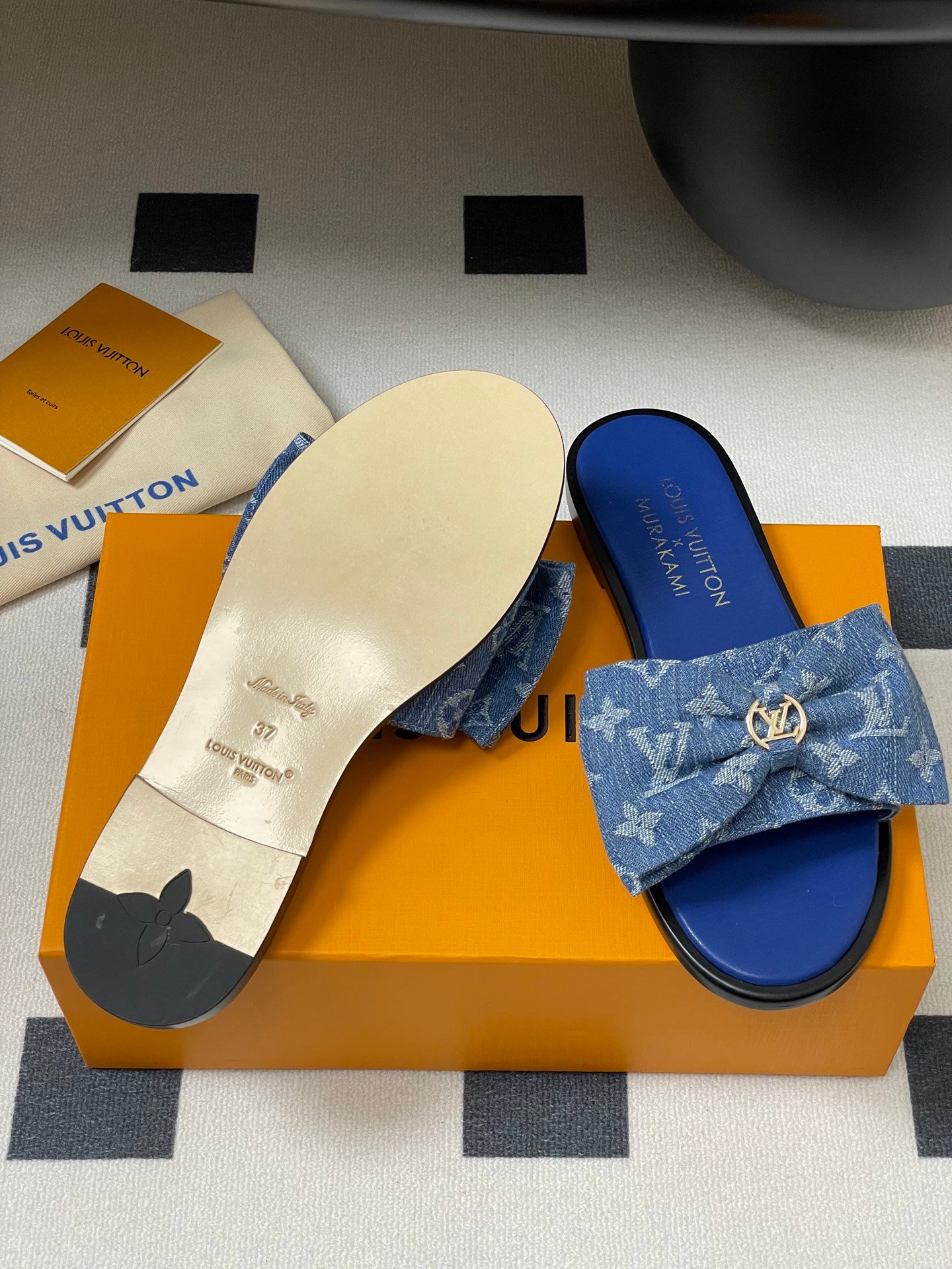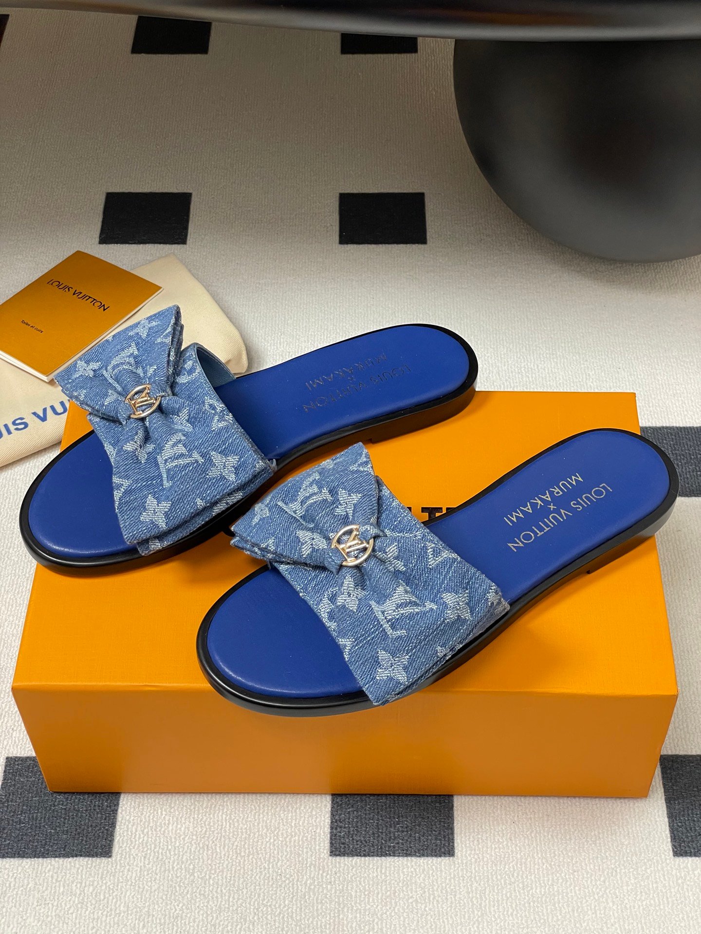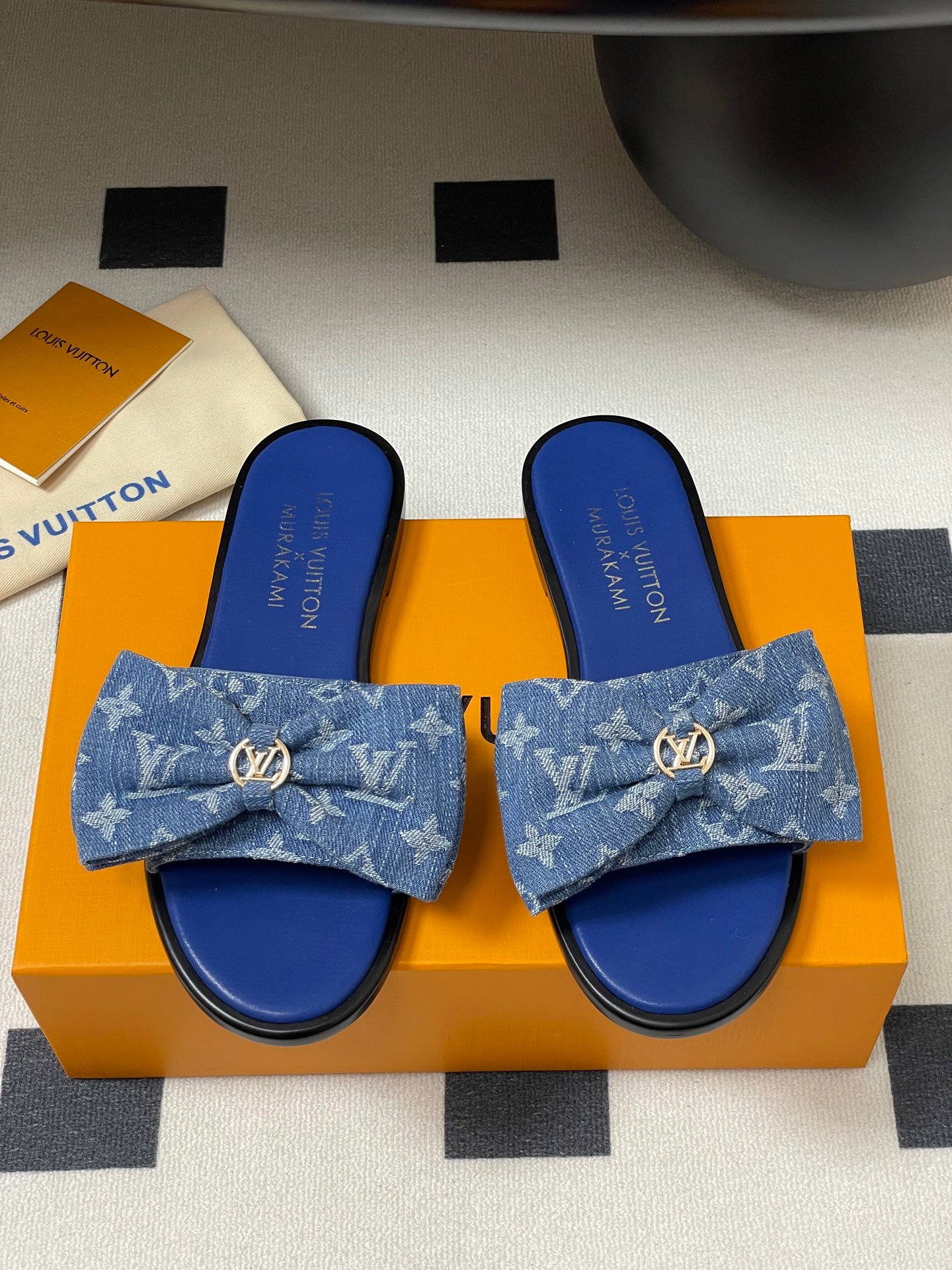 • Louis Vuitton x Takashi Murakami Lily Flat Mule Bow Slide Sandals Blue Canvas 1AGVYA
