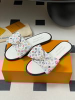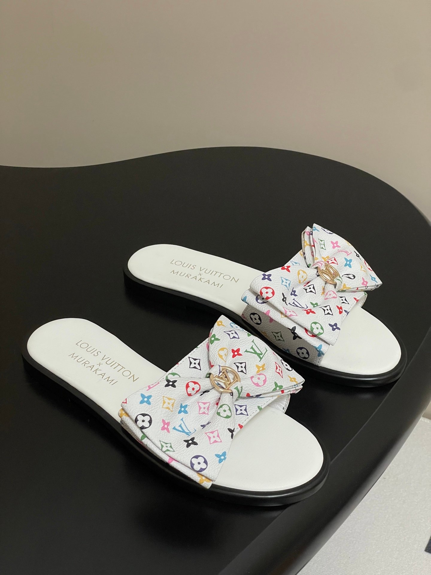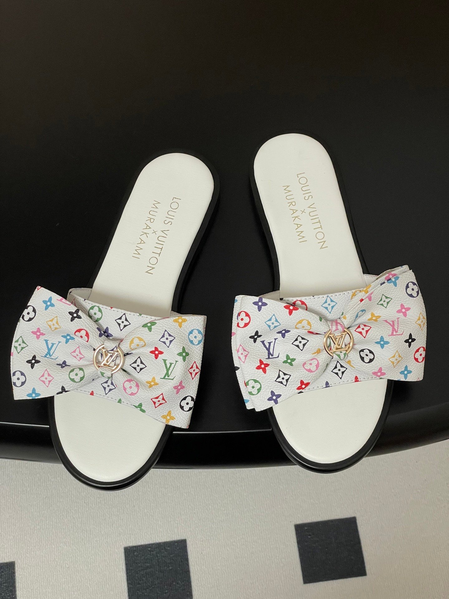 • Louis Vuitton x Takashi Murakami Lily Flat Mule Bow Slide Sandals White 1AGVYA