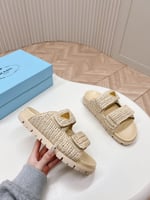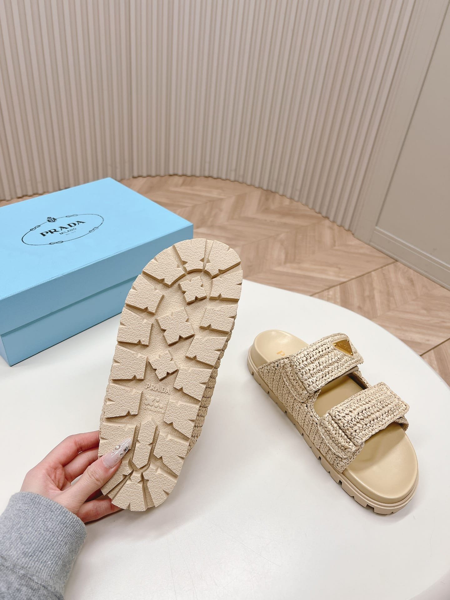 • Prada Fussbett Raffia Dual Buckle Slide Sandals Beige