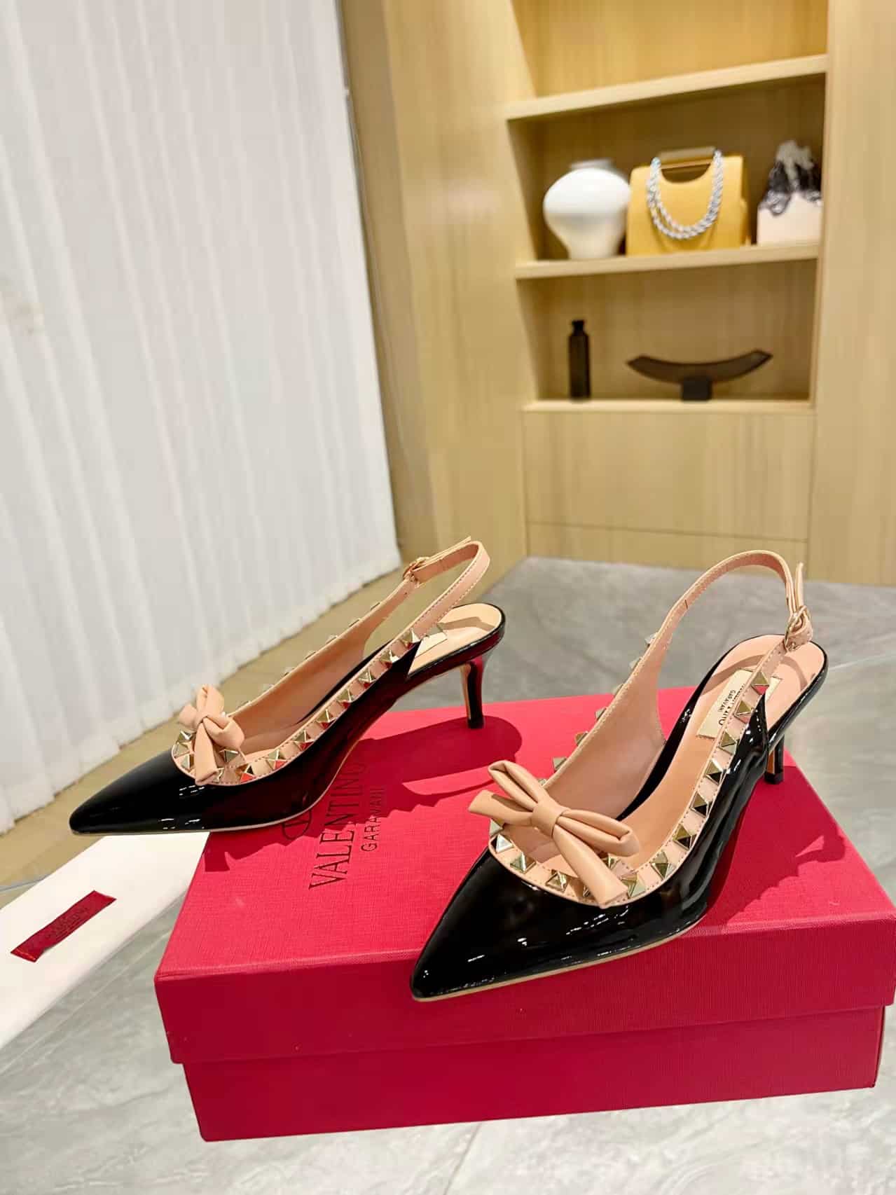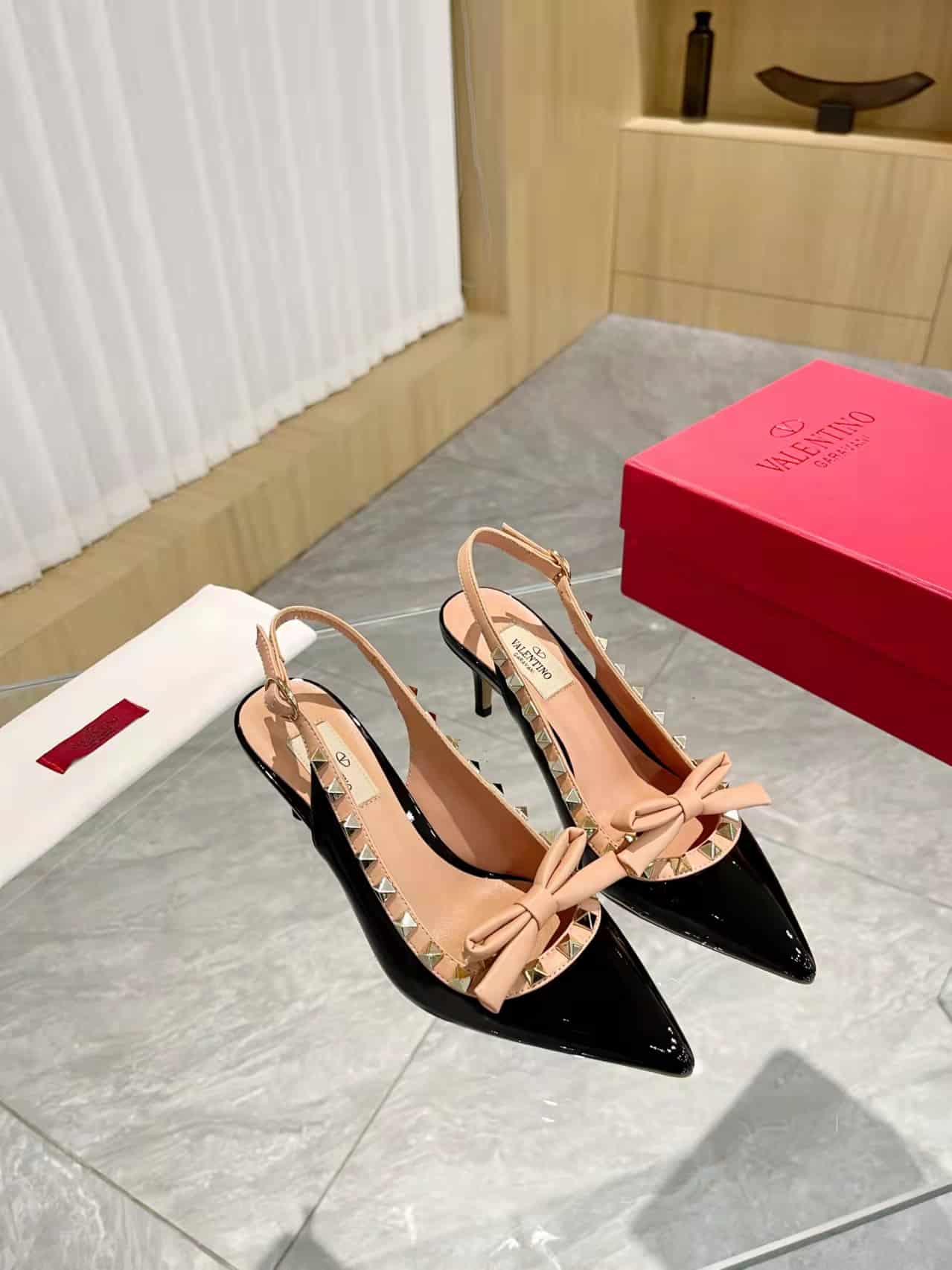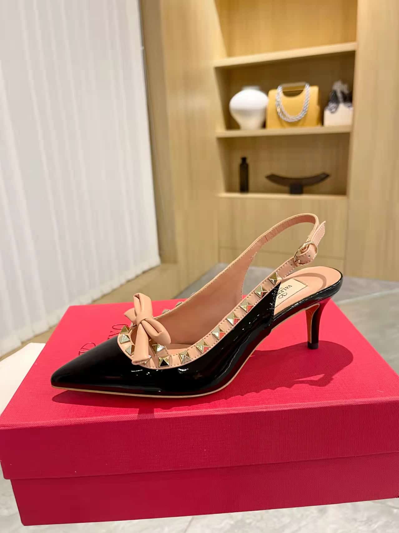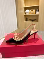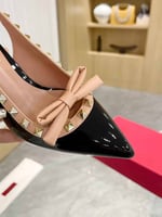 • Valentino Rockstud Bow Slingback Pump In Patent Leather With Matching Studs Beige And Black