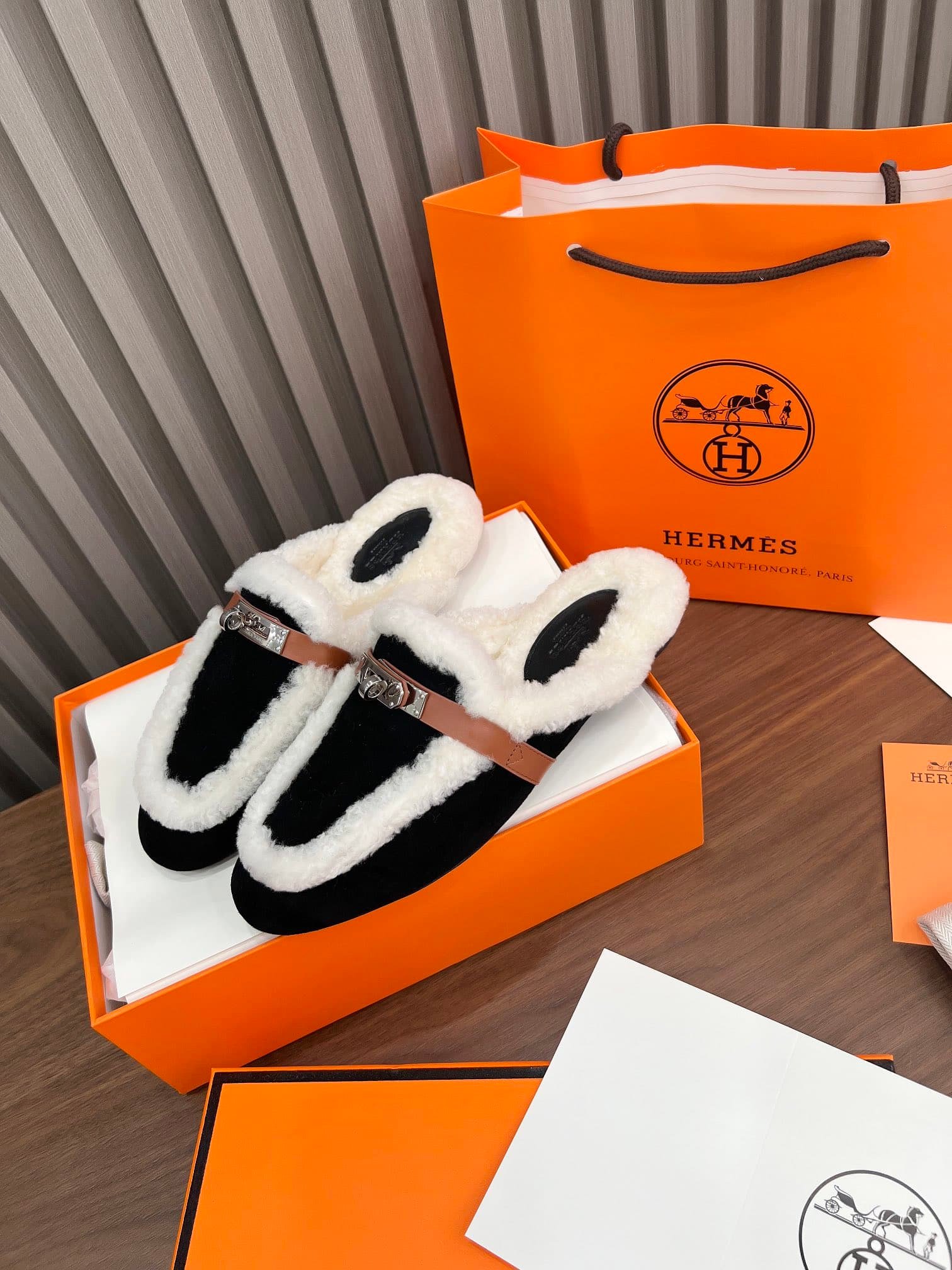 Hermes Oz Mule Shearling Black White