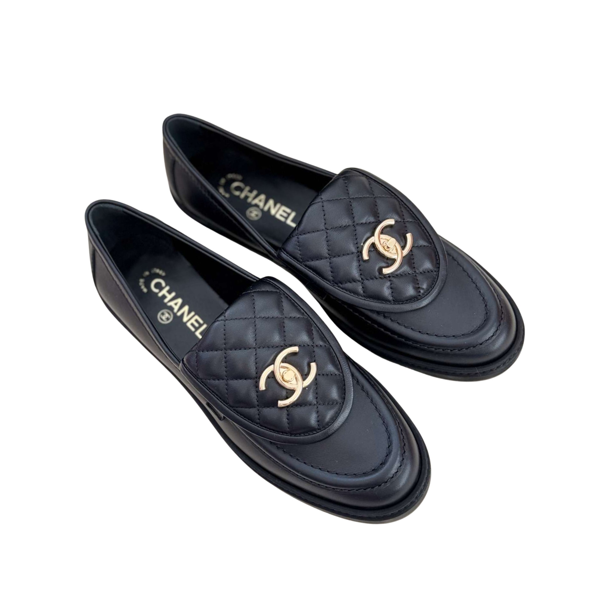Chanel Quilted Leather Loafers Black with Gold CC Logo