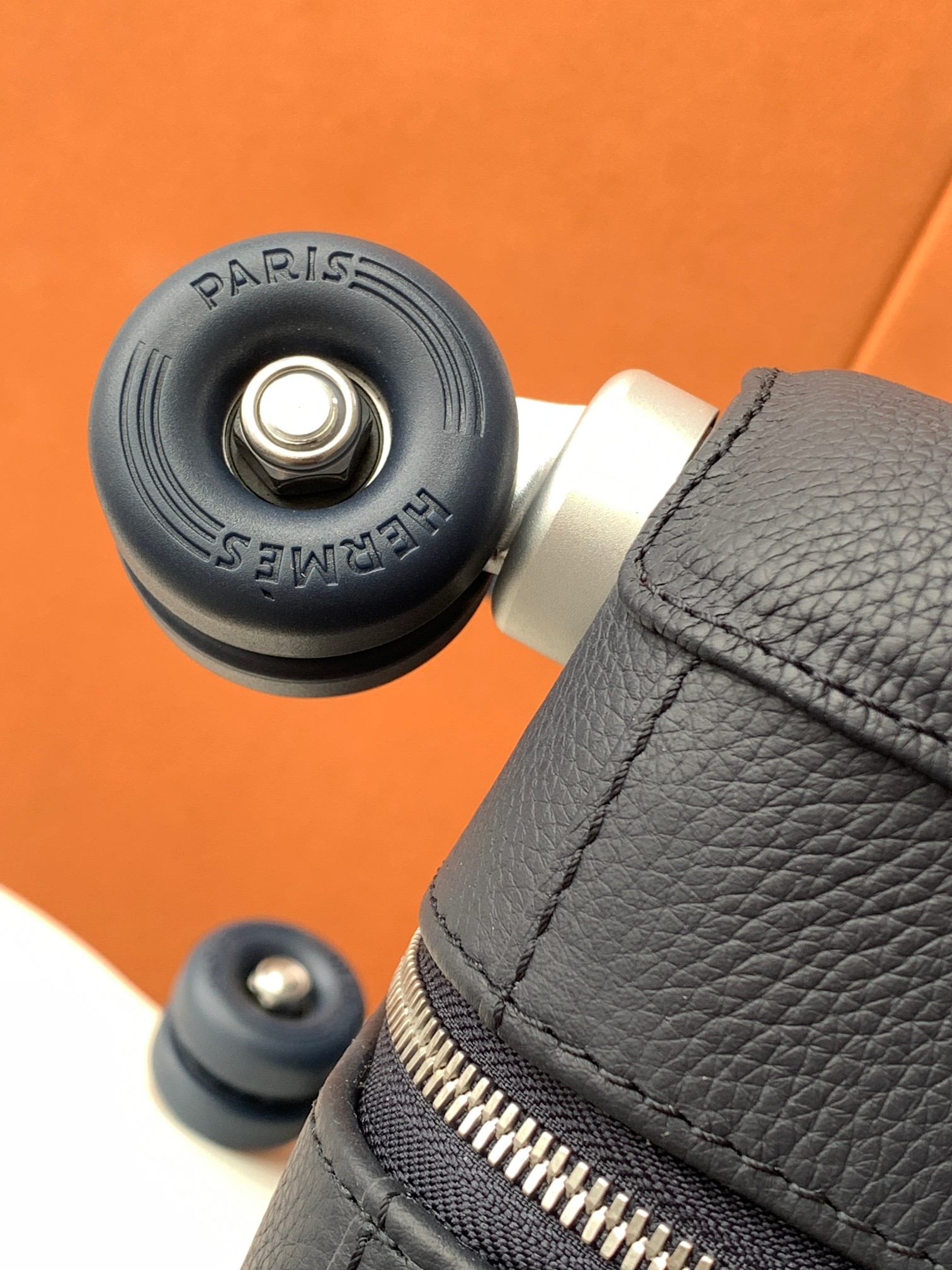 This luxurious Hermès travel suitcase is a perfect blend of elegance and functionality. Crafted from high-quality blue canvas, it features premium leather trims that enhance durability and add a touch of sophistication.