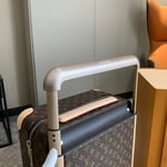 This Horizon 55 rolling suitcase in Monogram Macassar canvas, with touches of vibrant color on the reinforced corners, cane handle, and its compact wheels, is small enough to carry onto a plane. And yet its interior is remarkably roomy thanks to its external cane. The lining is in the same bright color as the exterior details.