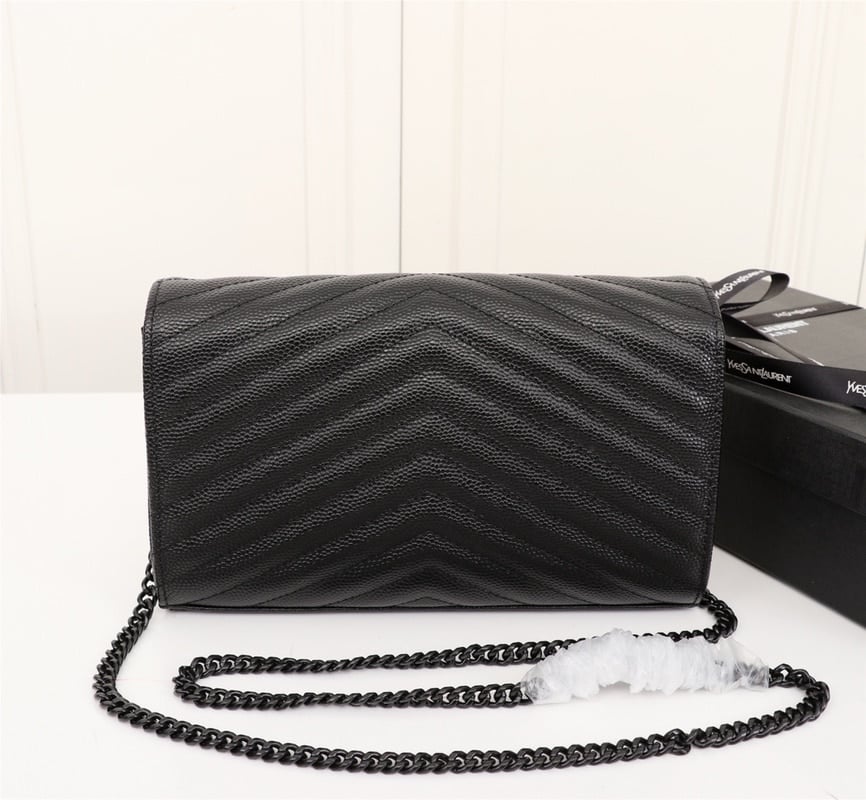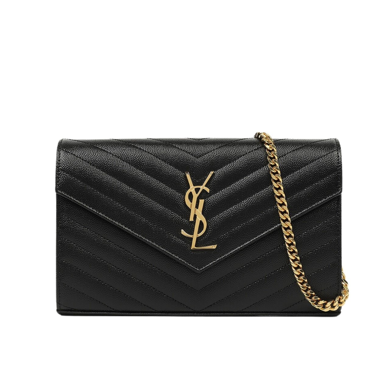 Saint Laurent Cassandre Matelasse Chain Wallet In Grain De Poudre Embossed Black Noir 22Cm