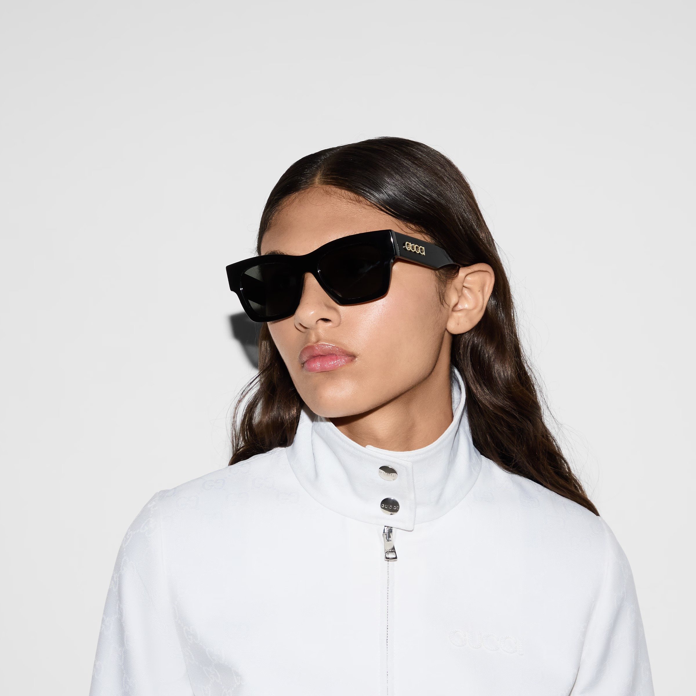The Cruise 2025 eyewear collection blends an essential silhouette with signature motifs. These rectangular sunglasses are accentuated by a Gucci logo.
