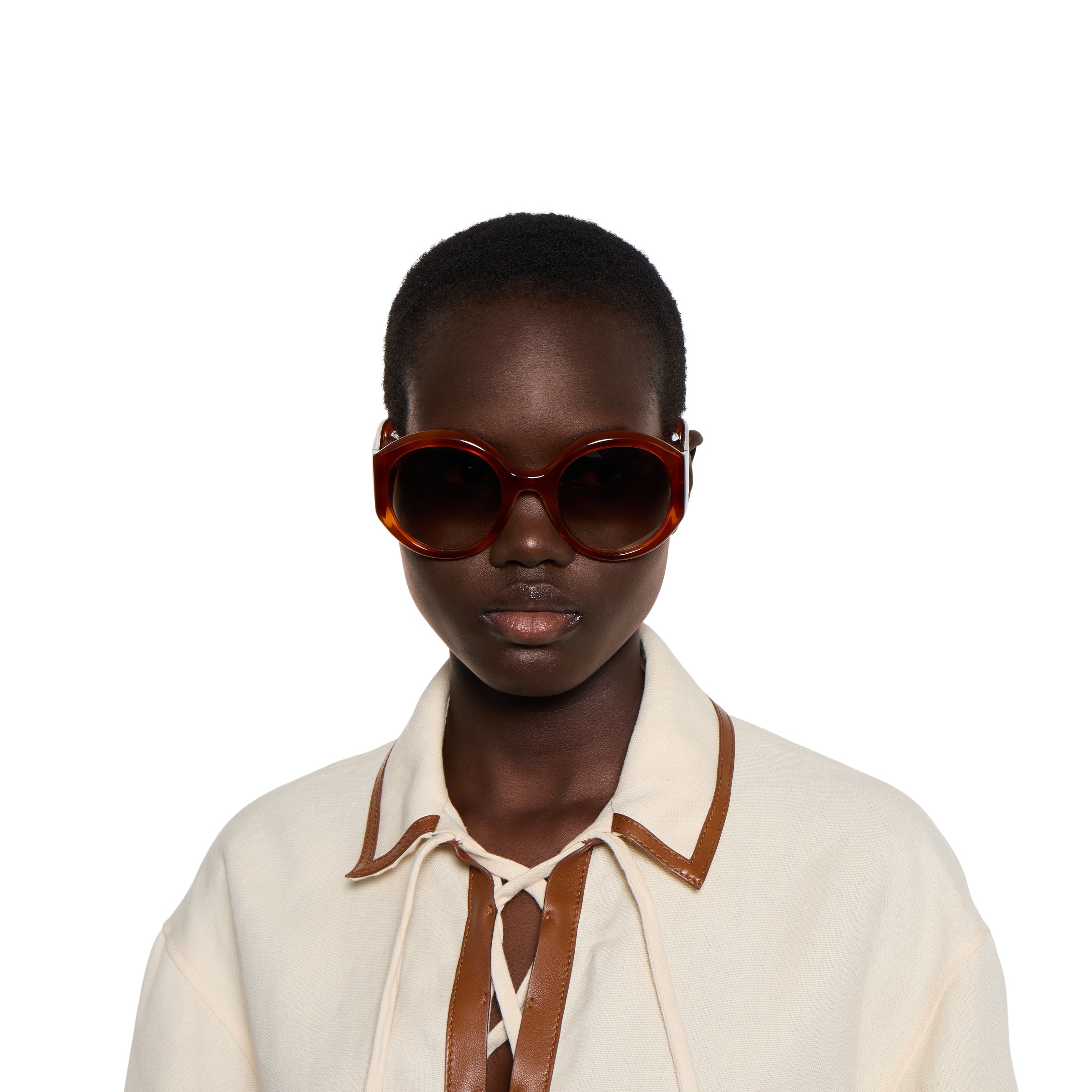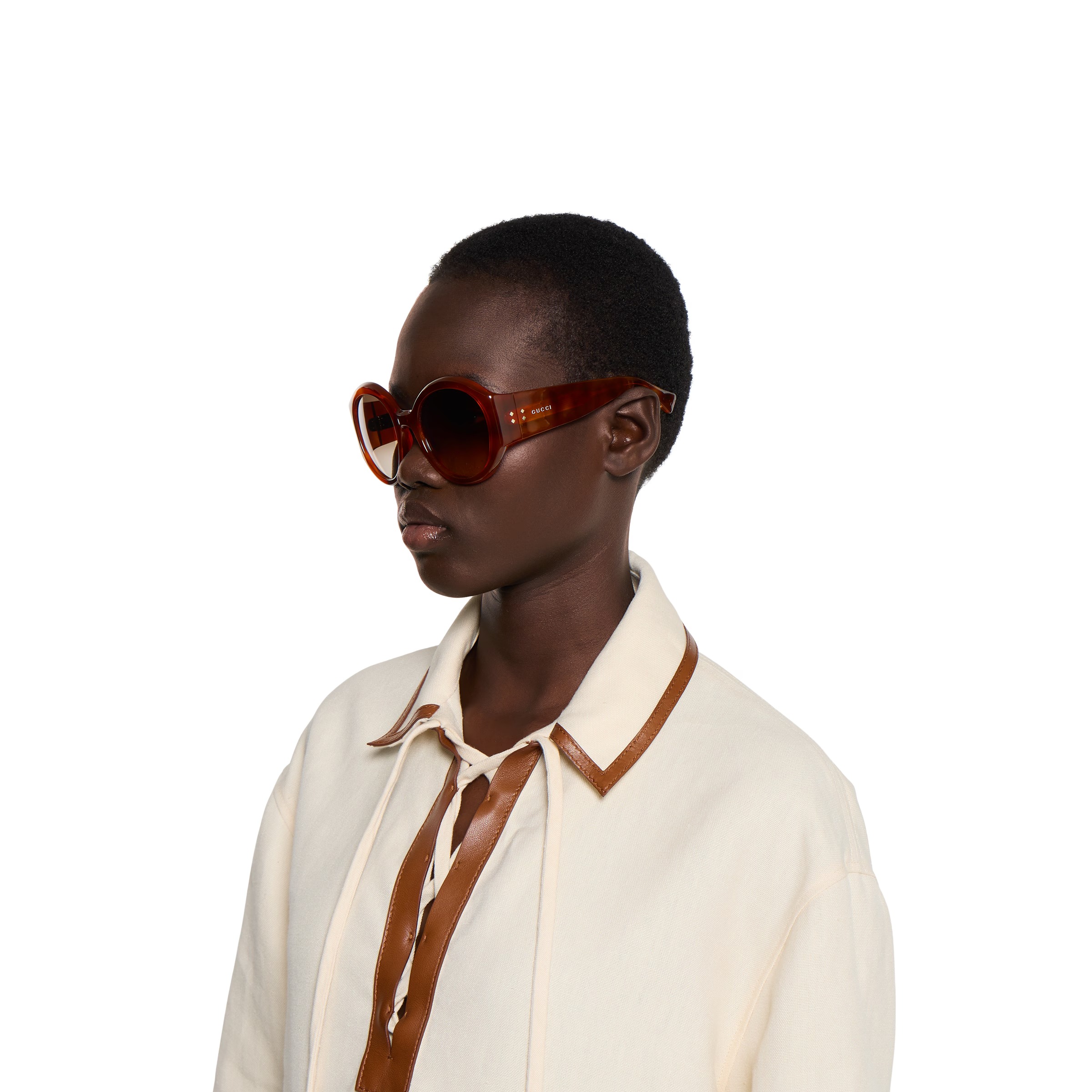 - Shiny light brown tortoiseshell acetate temples with Gucci logo detail and rivets