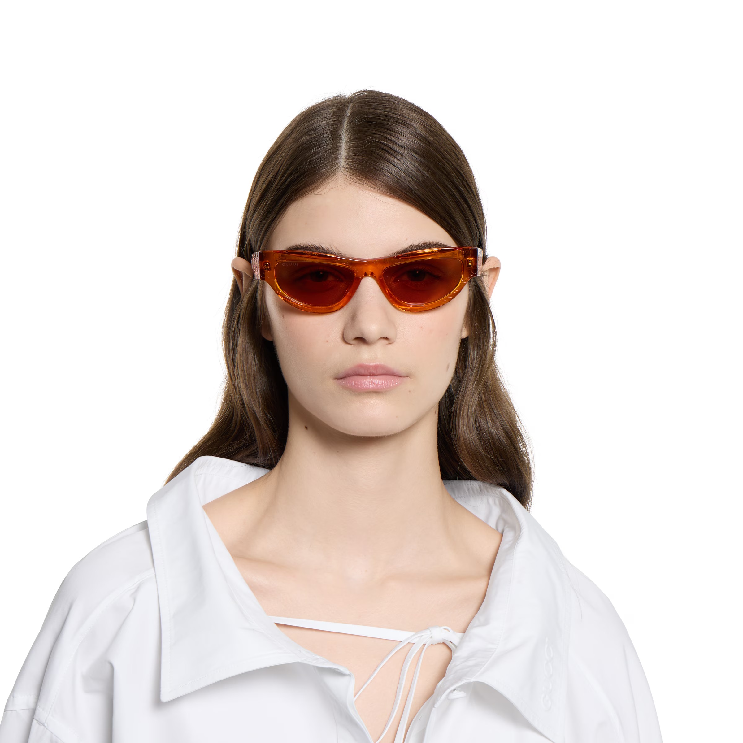 – Shiny transparent orange acetate temples with engraved allover GG motif