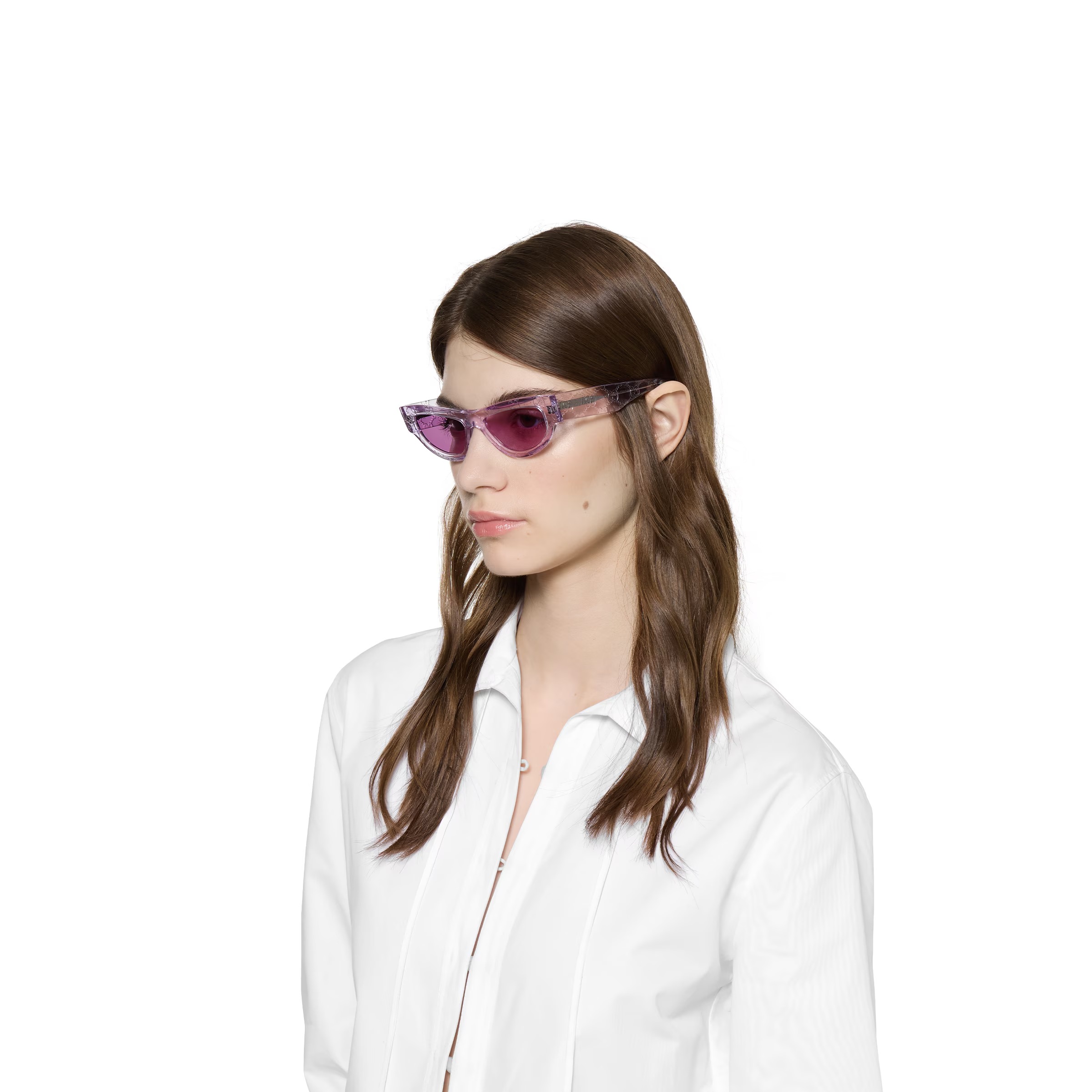 – Shiny transparent violet acetate temples with engraved allover GG motif