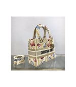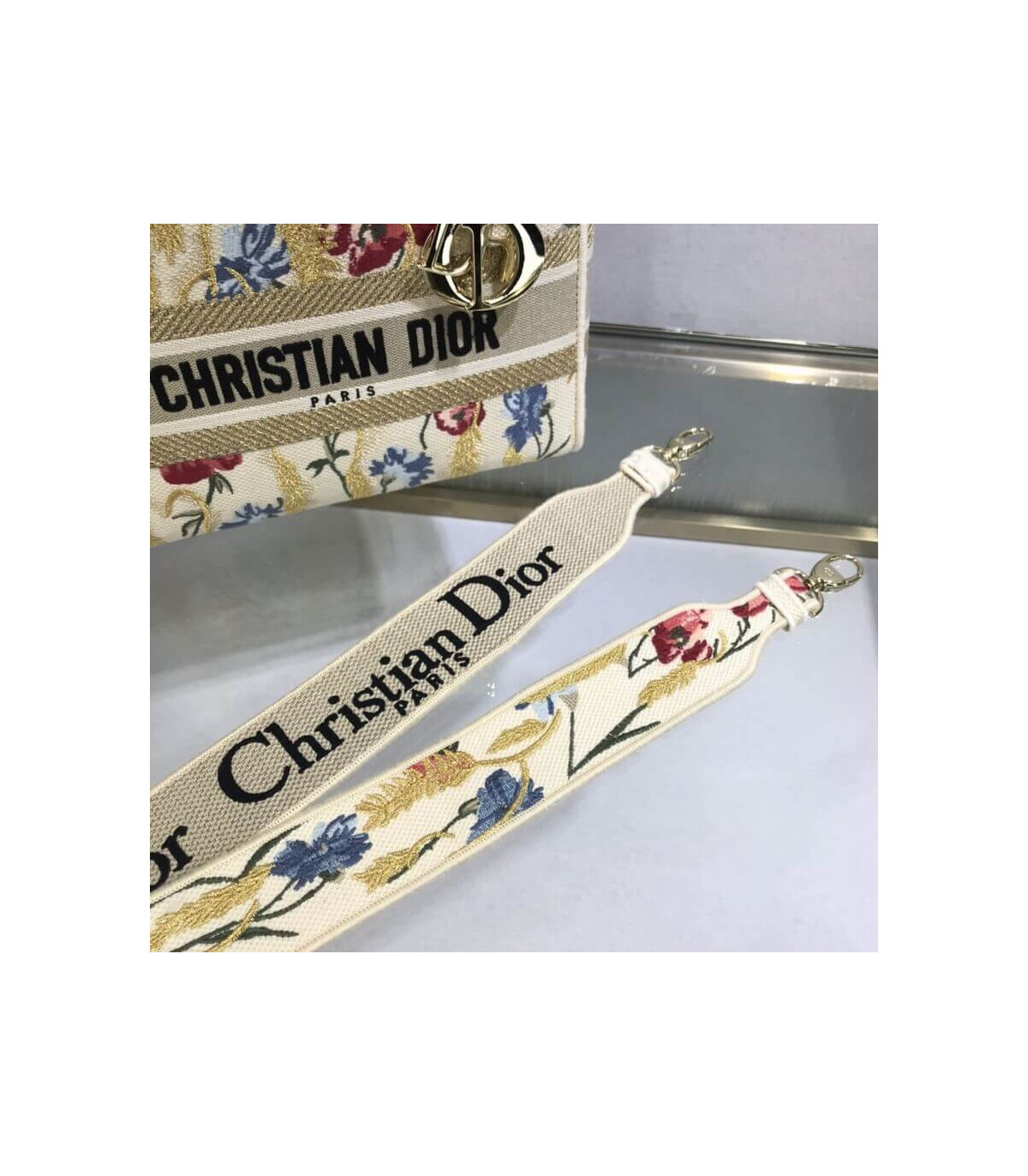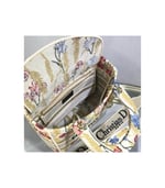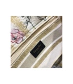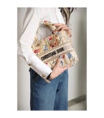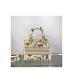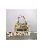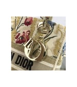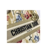 The Lady Dior handbag epitomizes Dior’s vision of elegance and beauty. Refined and sophisticated, the timeless yet relevant beige style is embroidered with the multicolor Dior Hibiscus motif accented with metallic thread, which is inspired by bucolic Apulian landscapes, one of the collection’s central themes. Along with the ‘Christian Dior’ signature, it features thick pale gold-finish metal ‘D.I.O.R.’ charms as well as a removable leather shoulder strap. The medium bag can be paired with the collection’s other Dior Hibiscus creations.